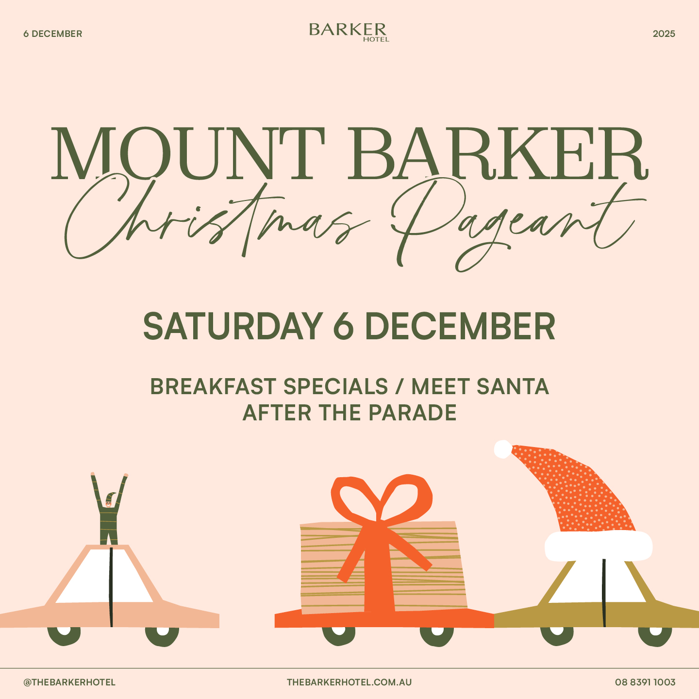 Mount Barker comes alive for its most magical morning of the year! Kick off with hearty breakfast specials at The Barker Hotel, then join the excitement as Santa makes his grand appearance after the parade. A festive morning full of cheer, laughter, and holiday spirit awaits – bring the family and make memories that sparkle!