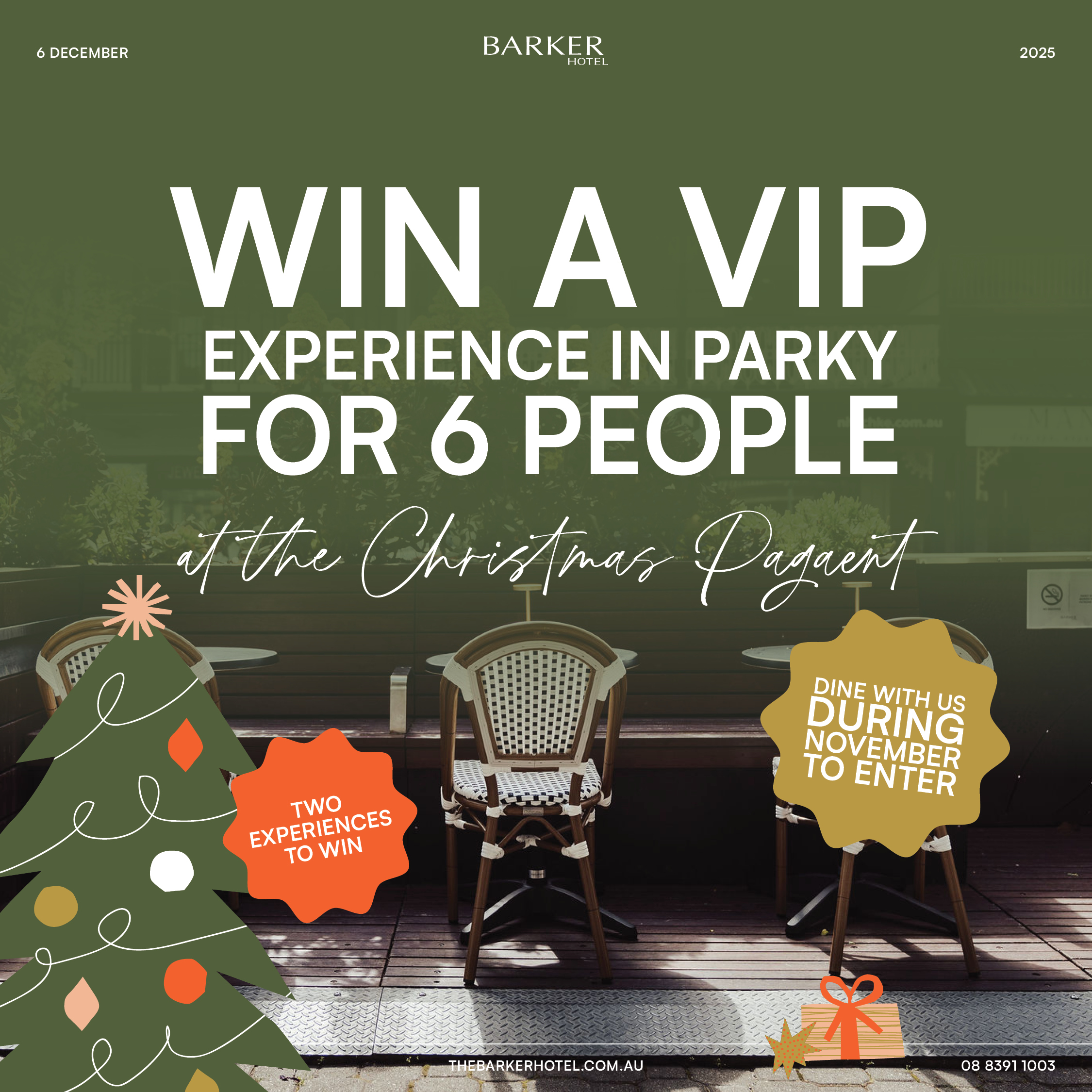 Dine with us this November for your chance to win a VIP experience in Parky for six people at the Mount Barker Christmas Pageant on Sat, 6 December! Enjoy prime views, festive cheer, and a magical day out with family or friends.