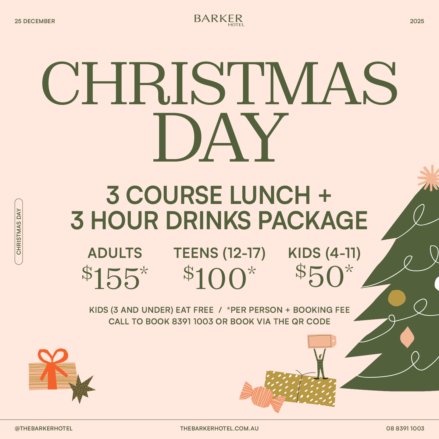 Celebrate with family and friends over a festive 3-course lunch, delicious food, and warm Christmas cheer. Adults $155, Teens $100, Kids $50 — book now!