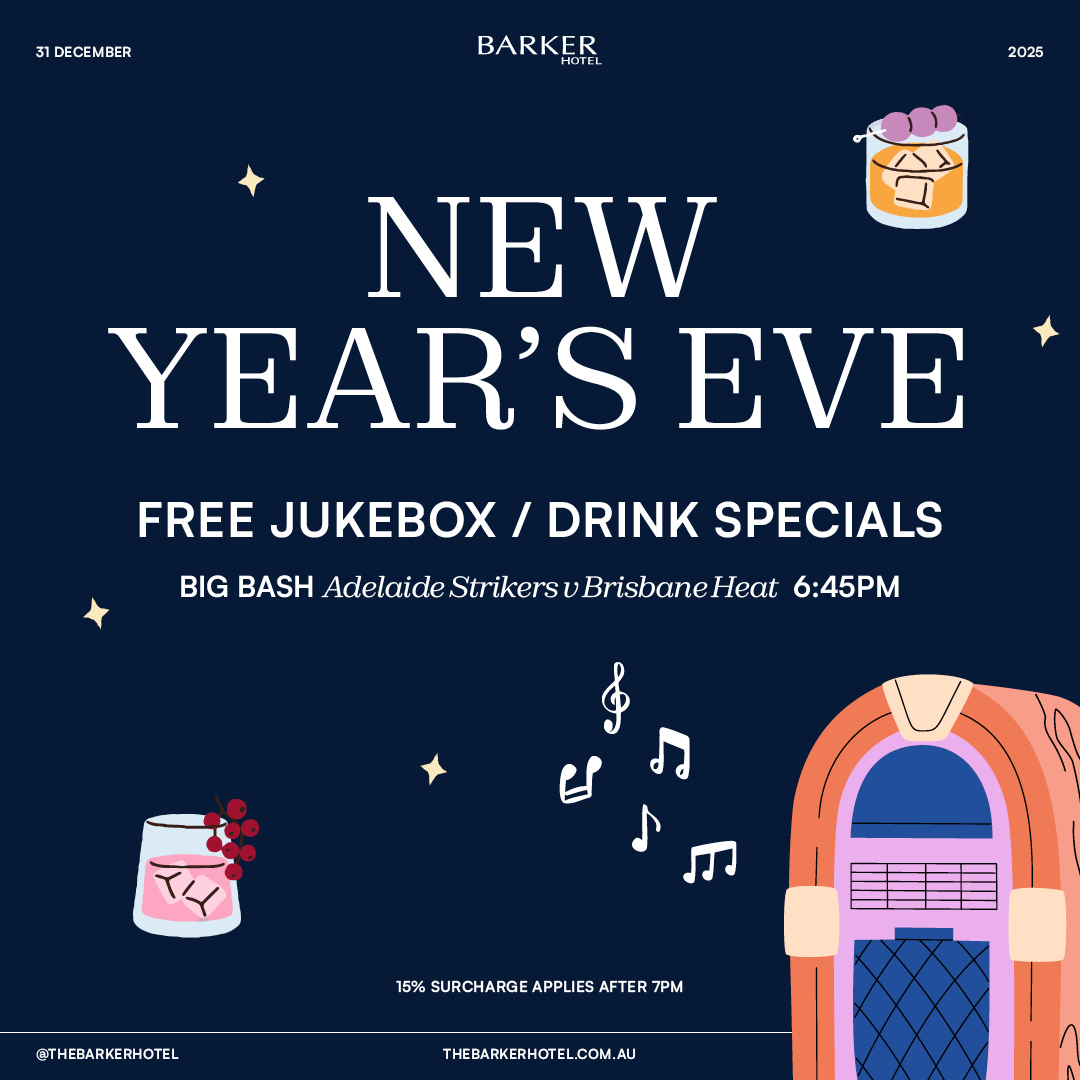 New Year’s Eve at the Barker Hotel with free jukebox, drink specials, and the Big Bash live from 6:45pm as Adelaide Strikers take on Brisbane Heat.