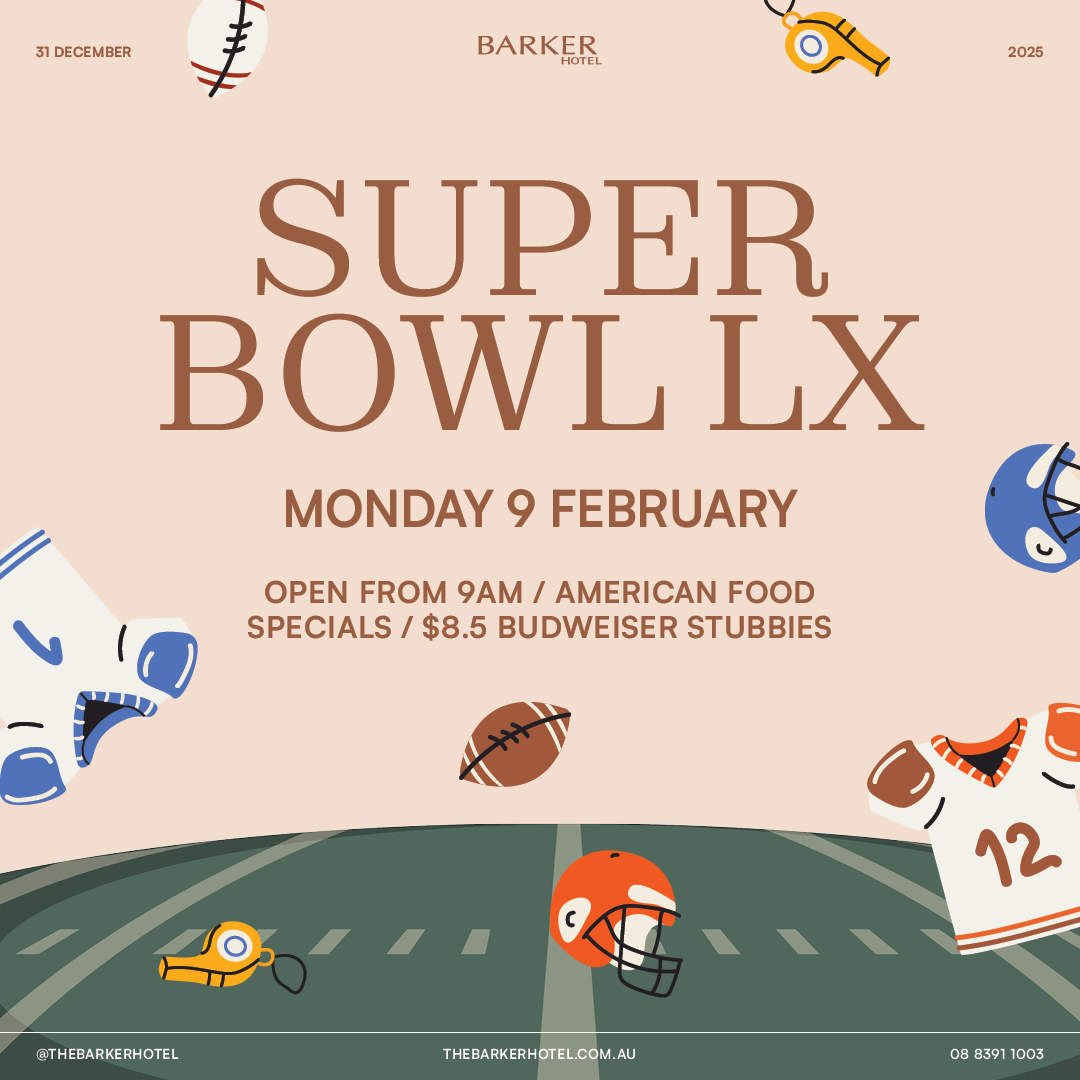 Super Bowl LX live at the Barker Hotel from 9am with American food specials and $8.50 Budweiser stubbies.